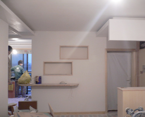 3、用45墻尼(粉刷石膏)找平墻面,(45墻尼具有保溫隔熱、耐火、隔音、粘結(jié)強(qiáng)度高,不易空鼓和開裂的特點(diǎn),具有呼吸功能可調(diào)節(jié)空氣濕度,改善居室環(huán)境)